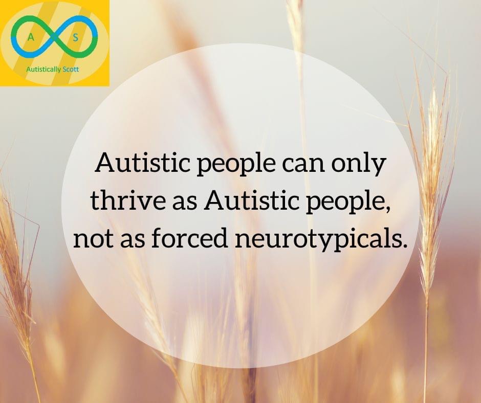 Image description: Background image of a wheat field with a brown, white and grey aesthetic. Black text with Aleo Light font in the centre that reads “Autistic people can only thrive as Autistic people, not as forced neurotypicals.” At the top left corner is the green & blue infinity symbol on a gold background for the “Autistically Scott” logo.